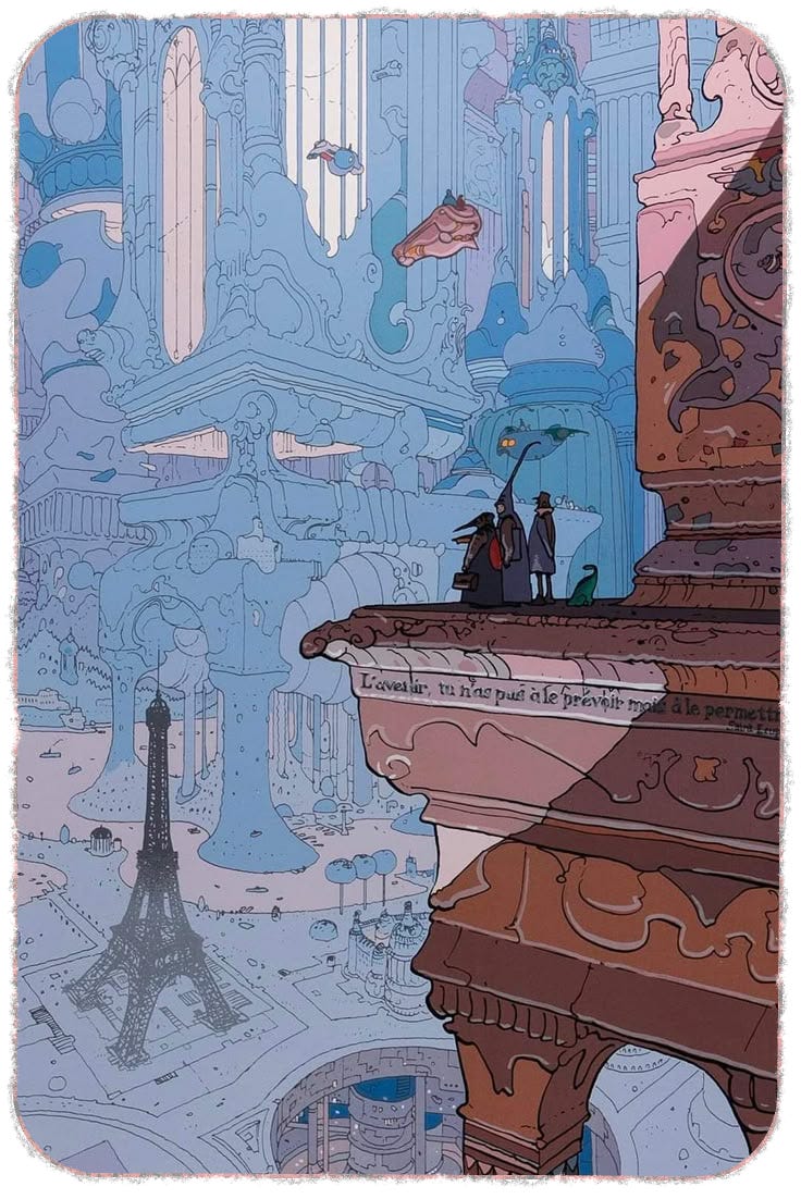 This invisibility is partly a matter of medium and partly a matter of geography. Comics, even now, carry less cultural prestige in the United States than they do in France, and the critical apparatus for evaluating them is correspondingly less developed. But there is something else, too, something harder to name. Moebius’s work operates at a frequency that resists easy description, not because it is obscure in the pejorative sense, but because it addresses itself to something prior to language, something that exists in the eye and the nervous system before it reaches the part of the brain that makes sentences. To write about it is already to falsify it. The images work by accumulation and atmosphere and a kind of visual logic that has no precise verbal equivalent, and the critical vocabulary for that kind of experience is, even now, relatively impoverished.